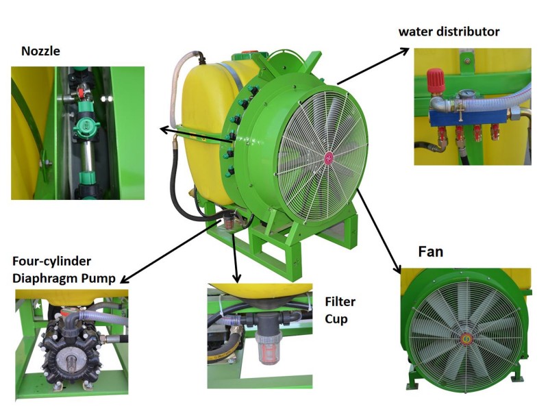 - Funcionamiento: Arrancar el tractor y ajustarlo a una velocidad de 3-8 km/h; Encienda el ventilador y la bomba rociadora, ajuste el ángulo de la boquilla y la presión según la altura y densidad del árbol.