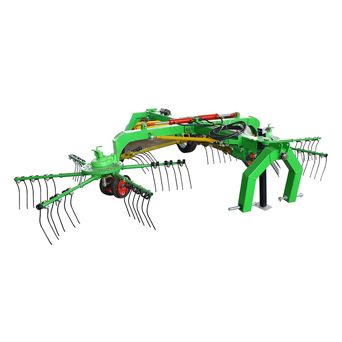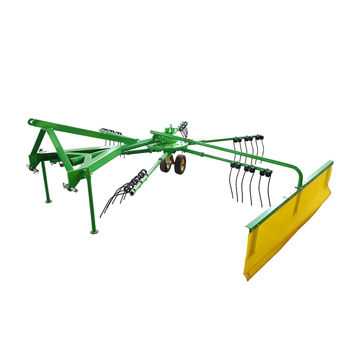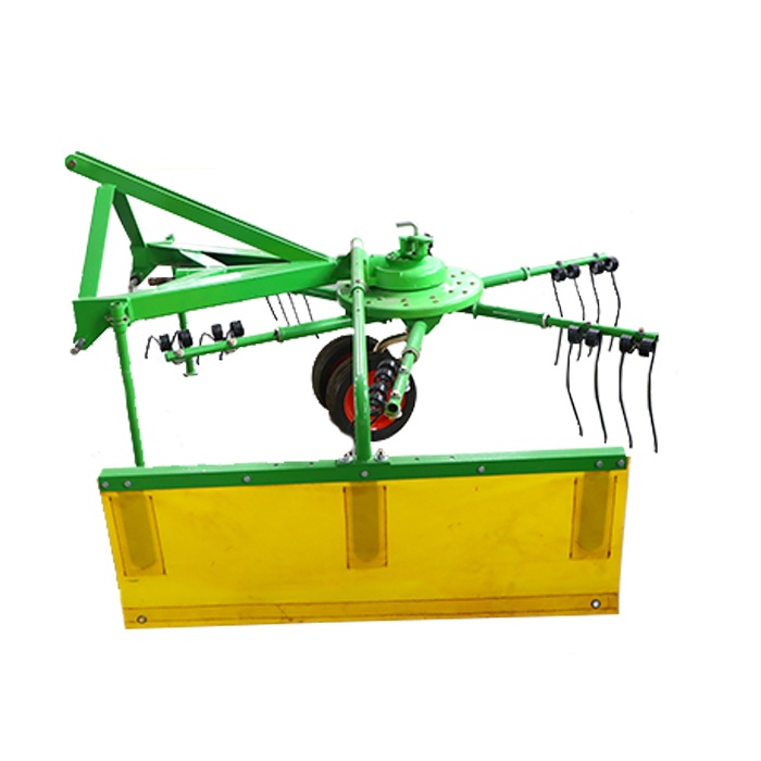 El rastrillo de tractores rotativos está disponible en rotary y tipo de resorte. Durante la operación, el rastrillo es arrastrado hacia adelante por el tractor y conducido por el eje de salida de potencia.