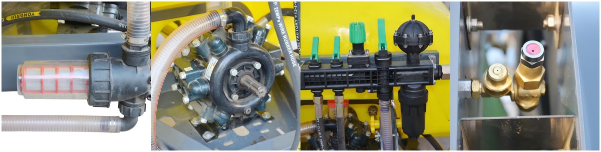 La bomba presuriza el líquido, que fluye a través de mangueras hasta las boquillas rociadoras. Estas boquillas atomizan el líquido en finas gotas, lo que permite que la máquina pulverizadora arrastrada cubra cultivos/huertos de manera uniforme en una sola pasada.
