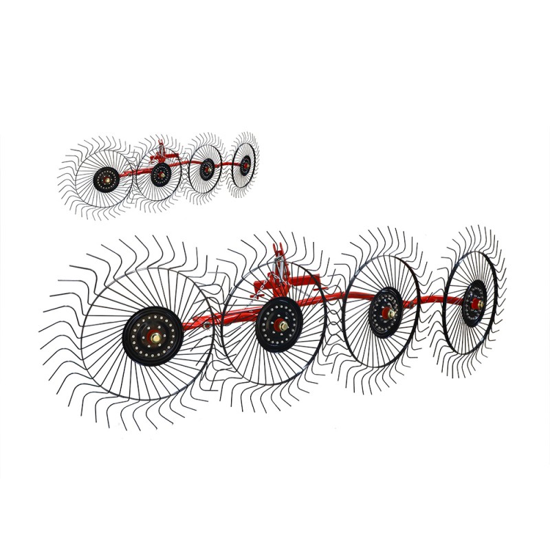 Este rastrillo de heno con ruedas utiliza una estructura de acero de alta resistencia, dientes de acero al manganeso de 12 mm de espesor y cojinetes sellados resistentes a la corrosión.